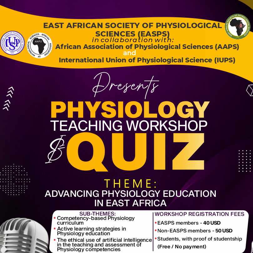 The East African Society of Physiological Sciences (EASPS), in collaboration with the African Association of Physiological Sciences (AAPS) and the International Union of Physiological Sciences (IUPS), is pleased to announce a Physiology Teaching Workshop and Inaugural Undergraduate Students Quiz. The Theme of the event is “Advancing Physiology Education in East Africa”.